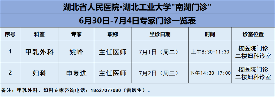 6月30日-7月4日,篮球比分网_篮球比分直播-欧冠买球投注推荐医院将邀请湖北省人民医院知名专家——甲乳外科姚峰主任、妇科申复进主任两位专家教授前来校医院坐诊(具体坐诊信息见下),请广大师生、周边居民持续关注南湖门诊专家坐诊信息,如有: