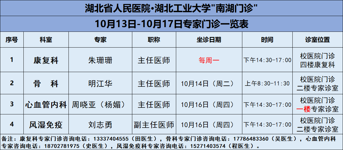 10月13日-10月17日,篮球比分网_篮球比分直播-欧冠买球投注推荐医院将邀请湖北省人民医院知名专家——康复科朱珊珊主任、骨科明江华主任、心内科周晓亚主任、风湿免疫科刘志勇主任四位专家教授前来校医院坐诊(具体坐诊信息见下),请广大师生、周边居民持续关注南湖门诊专家坐诊信息,如有: