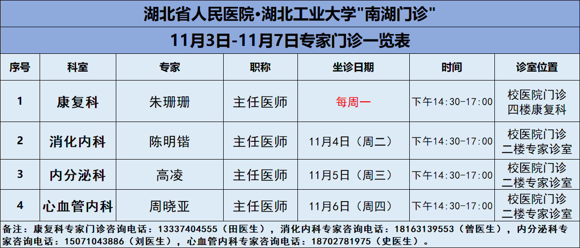 11月3日-11月7日,篮球比分网_篮球比分直播-欧冠买球投注推荐医院将邀请湖北省人民医院知名专家——康复科朱珊珊主任、消化内科陈明锴主任、内分泌科高凌主任、心内科周晓亚主任四位专家教授前来校医院坐诊(具体坐诊信息见下),请广大师生、周边居民持续关注南湖门诊专家坐诊信息,如有: