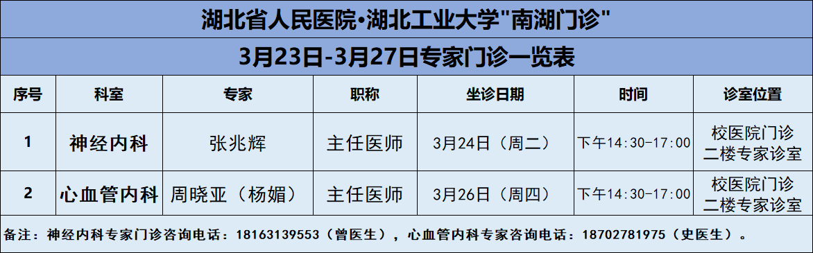 3月23日-3月27日,篮球比分网_篮球比分直播-欧冠买球投注推荐医院将邀请湖北省人民医院知名专家——神经内科张兆辉主任、心内科周晓亚主任两位专家教授前来校医院坐诊(具体坐诊信息见下),请广大师生、周边居民持续关注南湖门诊专家坐诊信息,如有:
