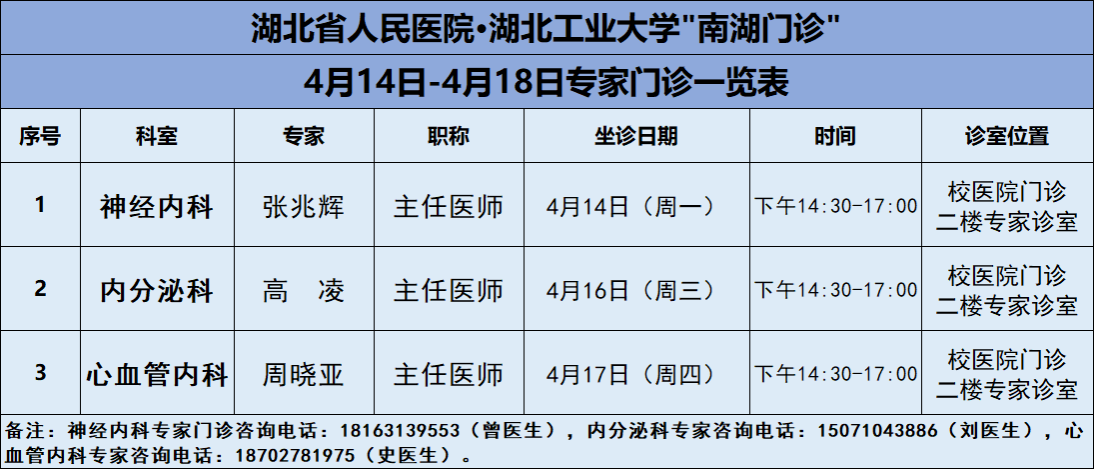 4月14日-4月18日,篮球比分网_篮球比分直播-欧冠买球投注推荐医院将邀请湖北省人民医院知名专家——神经内科张兆辉主任、内分泌科高凌主任、心血管内科周晓亚主任三位专家教授前来校医院坐诊(具体坐诊信息见下),请广大师生、周边居民持续关注南湖门诊专家坐诊信息,如有:
