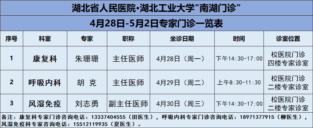4月28日-5月2日期间,校医院将邀请湖北省人民医院知名专家——康复科朱珊珊主任、呼吸内科胡克主任、风湿免疫科刘志勇主任三位专家教授前来校医院坐诊(具体坐诊信息见下),请广大师生、周边居民持续关注南湖门诊专家坐诊信息,如有