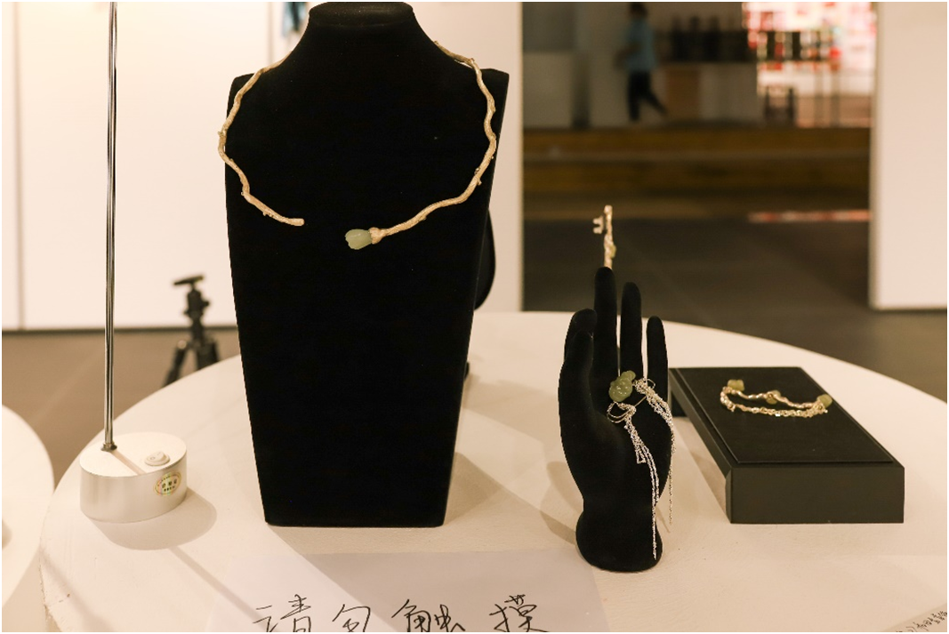 项圈、项链、手环、耳坠、发簪、胸针,这十余件玉雕首饰是张卓雅、李念文、拓跋兰君三名毕业生在老师黄雄指导下,学习半年后的首次展出成果。很巧的是,今年是学院第一年将玉雕作为毕业作品选题之一。“我们算是本专业毕业生中玉雕方向的‘开拓者’了。”张卓雅笑着说。